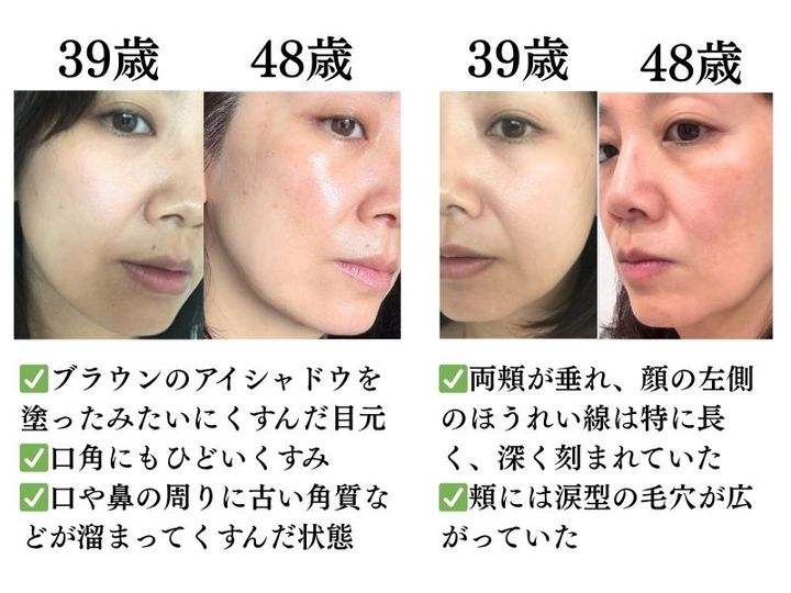 現在の画像も39歳の画像もiPhoneで撮影したものですが、カメラの性能が格段に向上したことを差し引いても、老け肌だった頃は顔全体のトーンがかなり暗く、部分的に角質などが溜まった状態が確認できるはず。