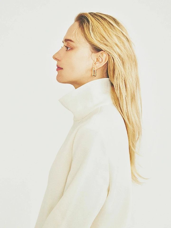つまったネックラインによって、引き立つアクセサリーや小物、ヘア。着こなし自体も、小物使いもシンプルなのにどこか華やか。スクエアのモチーフなら、ロングヘアとピュアなハイネックにも意思が宿る。 ゴールドスクエアフープピアス/ボーニー(エドストローム オフィス)