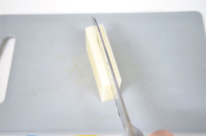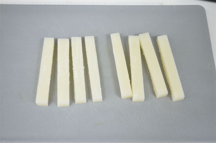 2. 角餅は厚みを半分にし、8等分の拍子切りにする。