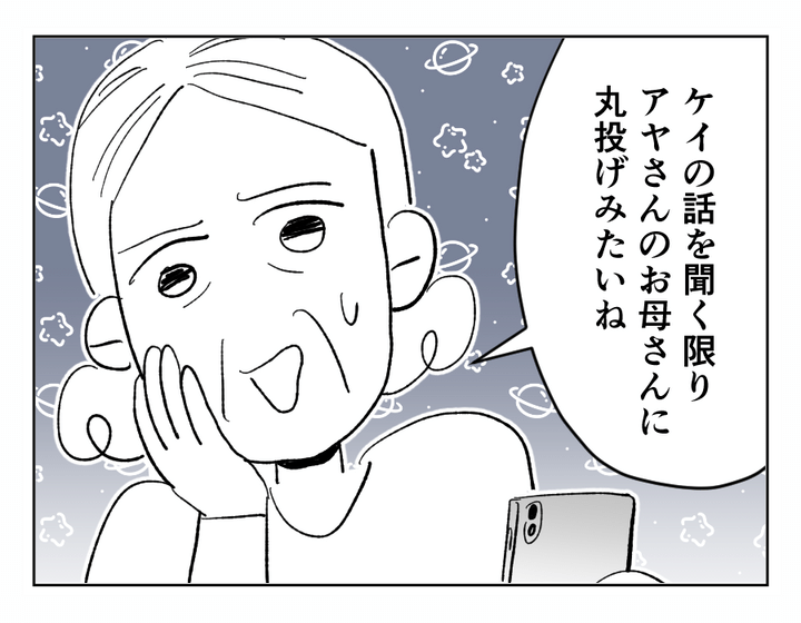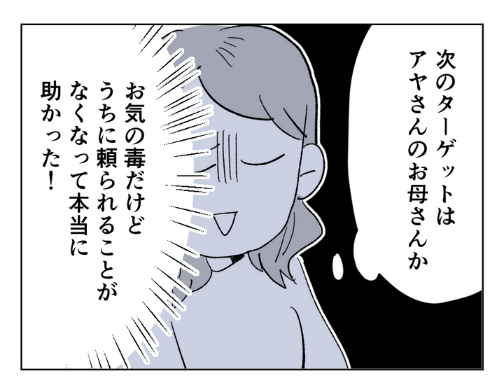 チサトさんは心にも時間にも余裕ができ、充実した日々を過ごせているようです。よかったですね。いっぽうアヤさんのお母さんはというと……穏やかな毎日が一変、孫の世話に追われる生活になってしまいました。しかもアヤさん、相手が実のお母さんなのでどんどん図に乗り、今となっては平日のトウマくんの世話を完全に丸投げ。最初の数日は「孫と過ごせて楽しいわ」などと言っていたお母さんでしたが、今ではげっそり。あまりの大変さに、疲労やストレスが溜まっていかないか心配です。