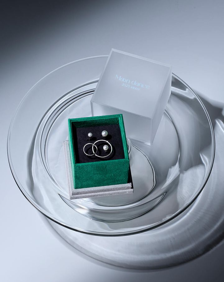 月の満ち欠けを感じさせる繊細なシルエットと、シルバーとパールの澄んだ輝きが、凛とした冬の装いに優しく寄り添う。