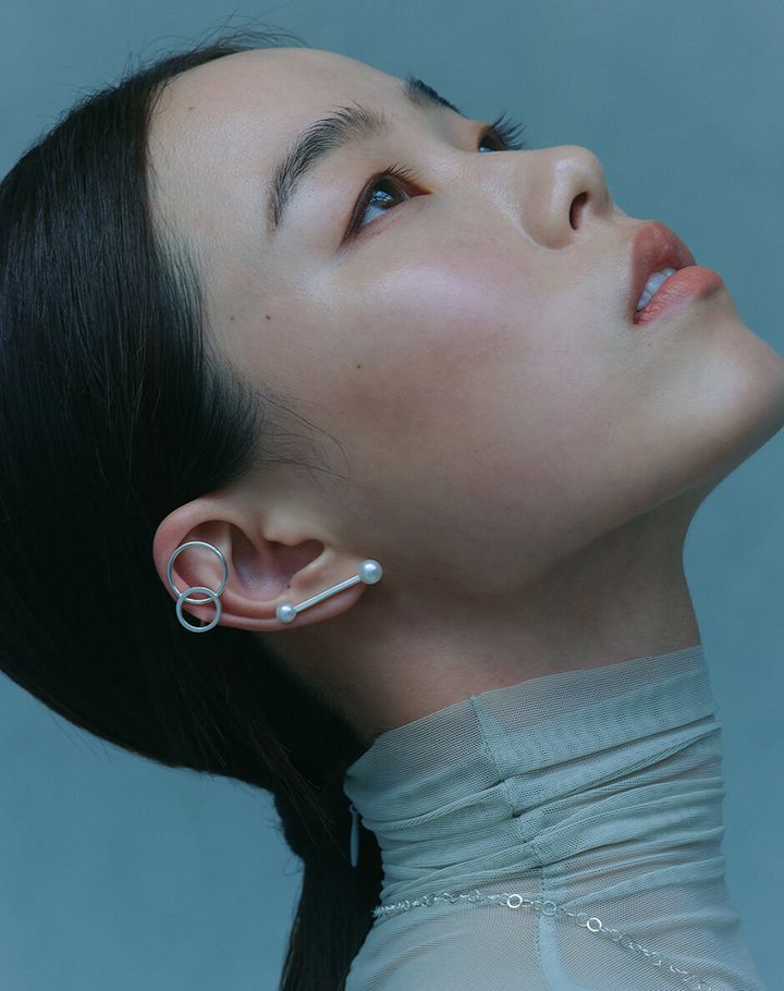 耳の上下左右、さまざまなポジションに着けられるデザインで、スタイリングの幅を広げる。