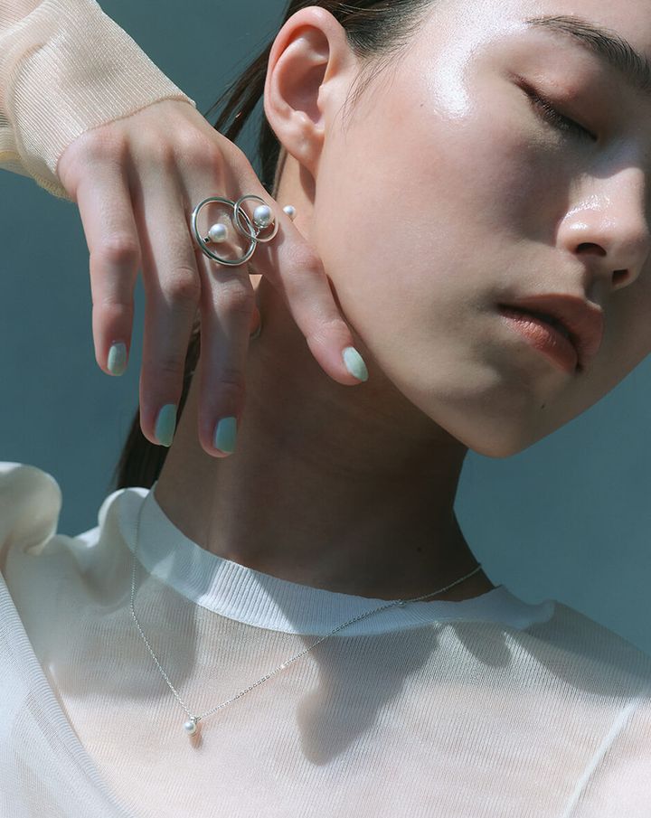 パールが指の間からのぞくディテールが、さりげない華やかさを演出する。