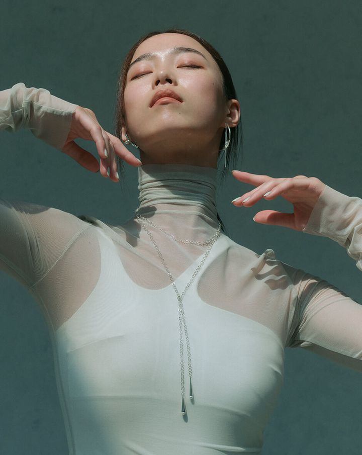 全長120cmのラリエット ネックレスは、多方向に光を反射するサークルのコマが連なるチェーンによって首元に明るさと存在感をもたらす。