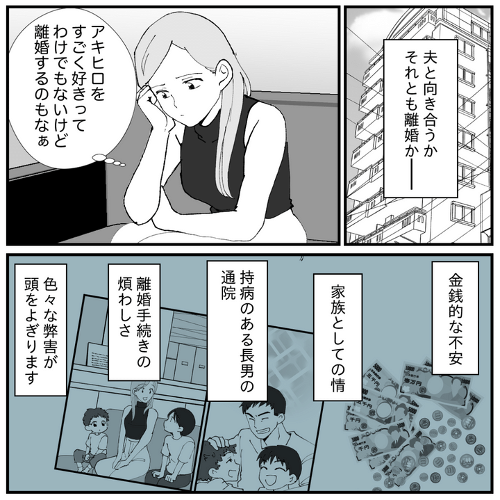 私は夫と向き合うべきか、それとも離婚すべきか、何度も考えました。金銭面や長男の持病のことを考えると、私は離婚に踏み切れません。