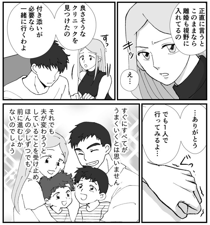夫と向き合うか、それとも離婚か。夫に対して情はあるし、離婚後の手続きや生活の大変さを考えると、今すぐ離婚とまでは思えません。怒鳴られるかもしれないけど……ちゃんと話してみることを決意しました。そして週末、夫が帰ってきました。私は夫にカウンセリングを受けることを提案したのです。