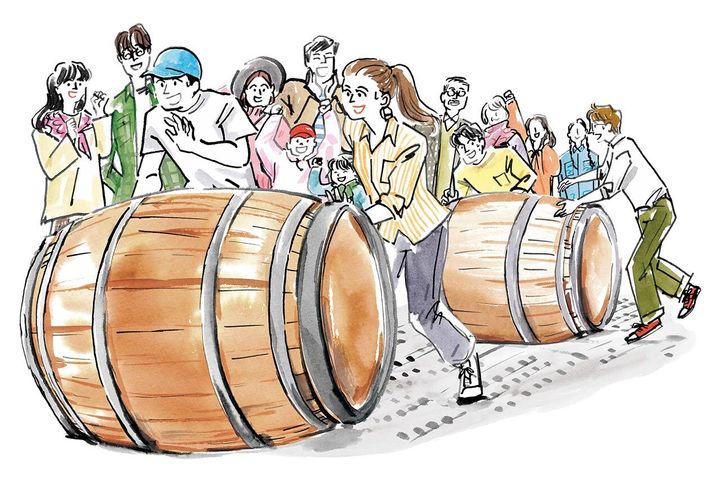 ワイン樽を2人1組で転がしてタイムを競う「ワイン樽転がしレース」と、ワイングラスをトレーに乗せて倒さずに運ぶ「ワイングラス運びレース」を開催。キッズレースもあるので、子供も楽しむことができるプログラムだ。