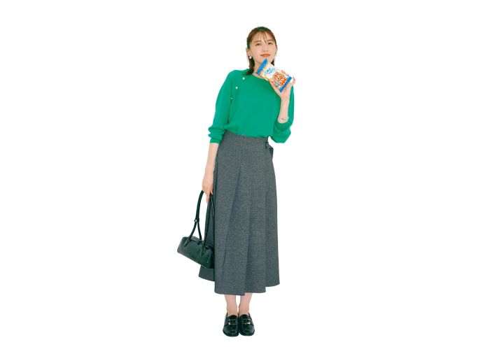 キルトスカート¥5,995/ロペピクニック(ジュン) カシミヤニット¥37,400/ルーニィ ローファー¥18,150/ダイアナ(ダイアナ 銀座本店) 横長バッグ¥17,380/Cepika(ジオン商事) バングル¥2,420/アネモネ、シルバー×パールイヤリング¥3,630/mimi33(ともにサンポークリエイト) モナ王 オープン価格/ロッテ