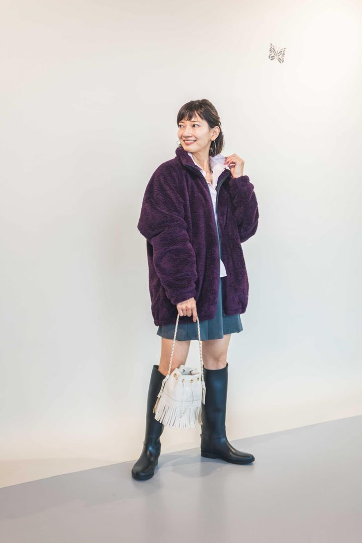 フリースジャケット¥4,990(ユニクロ アンド ニードルズ/ユニクロ)オックスフォードシャツ¥3,990(ユニクロ アンド ジェイ ダブリュー アンダーソン/ユニクロ)プリーツスコート(ユニクロ/ユニクロ)※ジャケットはXLサイズ、シャツとスコートはMサイズを着用 ブーツ、バッグ(全て私物)