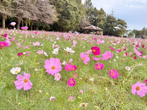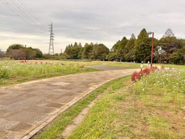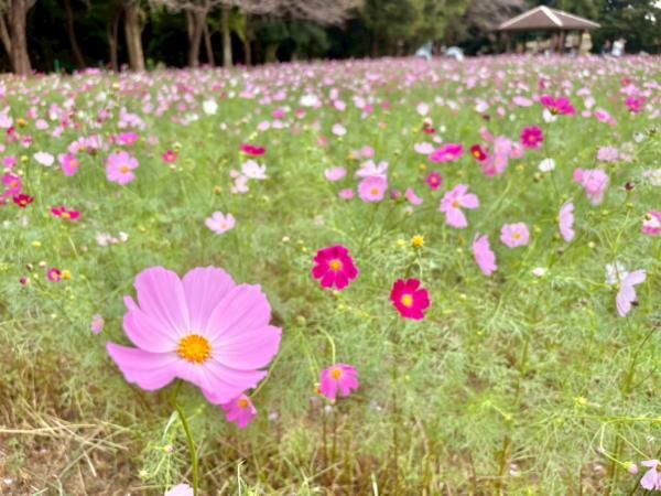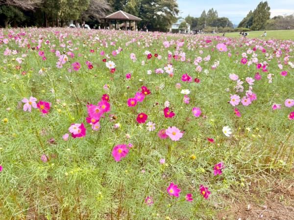 「大宮花の丘農林公苑」の敷地は、なんと10.9ヘクタール!東京ドーム約2個分以上の広さを持つかなり大きな公園なのですが、コスモス畑は比較的入り口から近い場所にあります。