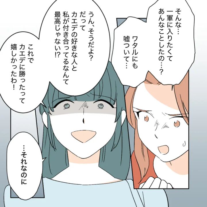 高校時代、いつも一軍グループの中心にいたカエデに憧れていたシズク。最初はカエデみたいになりたいと思うだけでしたが、徐々に嫉妬心を抱くようになり、嫌がらせをしたことを告白します。その後も、偶然ではあったが階段からサクラを突き落としたこと、自分が裏で糸を引いてワタルとカエデを引き離したこと、ショウマをうまく使ってワタルと自分がカップルになるように仕向けたことを淡々と話し始めました。カエデは「一軍に入りたくてあんなことしたの・・・?ワタルにも嘘をついて」とシズクの行動を非難しますが、シズクは反省するどころか開き直り「だってカエデの好きな人と私が付き合ってるなんて最高じゃない!?これでカエデに勝ったって嬉しかったわ!」と歪んだ表情で言いました。