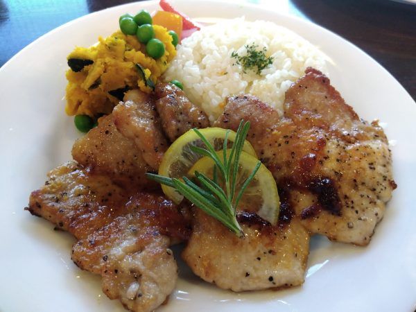 しっかり焼き上げた国産もち豚をレモンと共に。ニュージーランド産マヌカハニーをたっぷり使ったジンジャーハニーソイソースで仕上げているそう。びっくりするくらい柔らかくて、オイシイ~。かぼちゃマッシュ、自家製ピクルス、バターライスを添えられていて、ボリュームたっぷり!大満足です~。