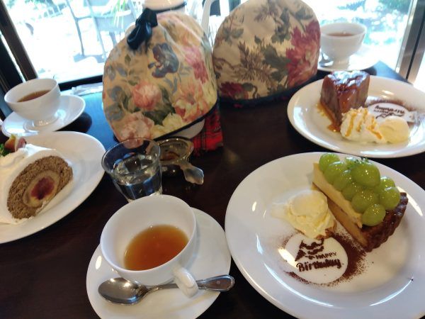 実はこの日は3人のお誕生日会だったので、お店の方に伝えるとココアパウダーでケーキ皿に誕生日メッセージをサービスしてくれましたよ。小さなハッピー♪大きな自家製ケーキは、甘さ控えめでオイシイ~。ドリンクは、セットドリンクメニューから季節のフレーバーティー・千一夜物語をチョイス。ポットサービスなんですよ。ステキ時間満喫です!