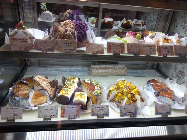 自家製ケーキは、入口前のショーケースの中から選べますよ。どれも魅力的で、迷いますよね~。テイクアウトは、15時~可能ですよ。
