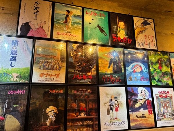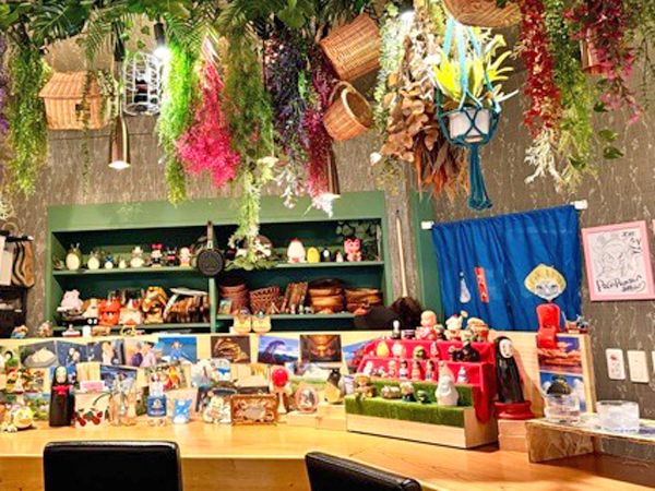 テーブル席4つとカウンターのみのこじんまりとした空間ですが、すみずみにまでグッズが並んでいます。壁一面には歴代のジブリ作品のジグソーパズル。映画のワンシーンを彩るポストカード、カウンターごしにはフィギュアやぬいぐるみ、マグカップやプレートなどがところせましと置かれています。座席には人気キャラクターのクッションまで! 薄暗い店内はどこか幻想的で、日常から解き放たれ開放感でいっぱいになります。
