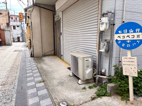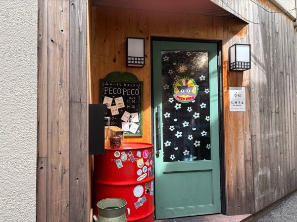 商店街の横道を曲がり進んだその先に、ブルーのバス停が見えます。そこには「七国山行」「ペコペコ前」と書かれています。おなじみ「となりのトトロ」ですね~♪予約時間までここで並んで待ちます。道をはさんだ路地裏を進むと赤いドラム缶と手作り看板にはPECOPECOの文字が見えます。扉を開けた瞬間、一気に非日常の世界へひきこまれますよ。
