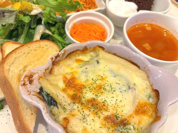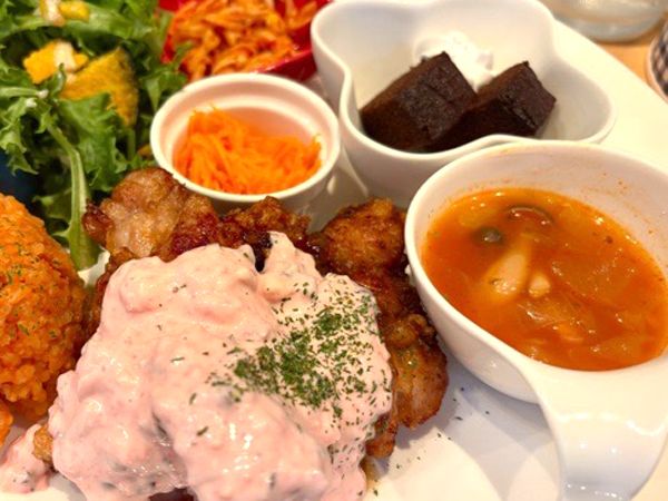 気になるランチは「チキン南蛮プレート」と「グラタンセット」の2種類から選べます。どちらもデザートとドリンクがついて1650円はお得ですね。プラス料金で特製の“ポニョの世界観”が味わえるスカイブルーのジュースに変更も可能です。 「チキン南蛮プレート」は、サックサクの衣の上にたっぷりのタルタルソースがかかっています。ピンク色が好きなオーナーに合わせてスタッフが作った特製タルタルです。ミネストローネ、にんじん、ライスのオレンジ色などビジュアルも満点ですね。マグカップには「魔女の宅急便」のジジが♪