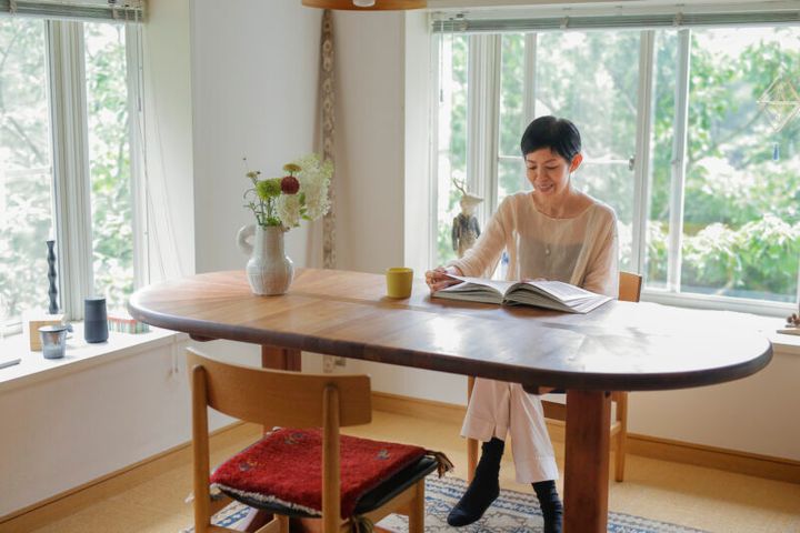 ー大きなダイニングテーブルは、前のオーナー様からご好意で譲り受けたもの。「組み木の天板が素敵ですよね。ありがたくいただきました」