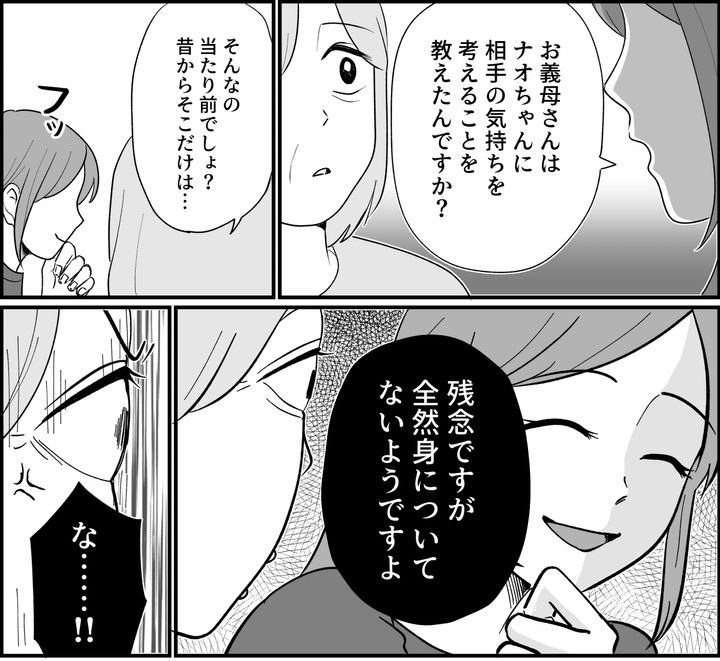 義母は、ナオちゃんに「相手の気持ち」を考えることを教えたのでしょうか? 義母は自信たっぷりに「当たり前よ」なんて言っていましたが、残念ながら身に付いてはいないようです。そのことをご指摘して差し上げると義母は驚いたような顔をしています。