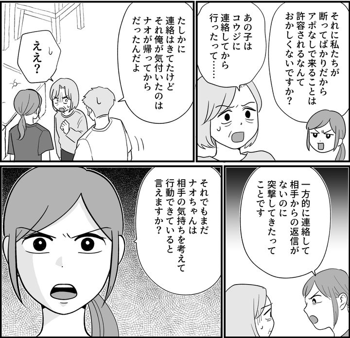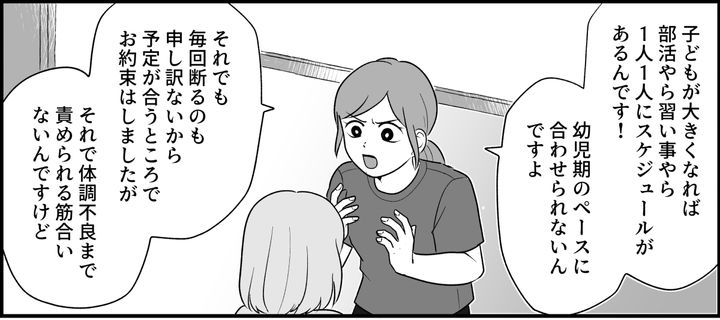そもそも交流したいと思っているのは、ナオちゃんたちだけです。それに、子どもが大きくなれば、部活やら友達やら習い事やらで、それぞれスケジュールがあります。幼児期のペースには合わせられません。それでも毎回断るのも申し訳ないから、ちょうど予定が合うところでお約束はしましたが、それで体調不良まで責められる筋合いはないのです。