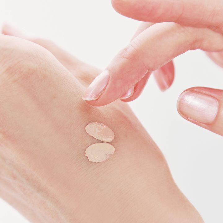 下地とファンデで隠しきれないシミや肝斑はコンシーラーでカバー。リキッドタイプをファンデと混ぜて塗れば、境目が目立たず広範囲にも使えます。手の甲に出して色を調節。