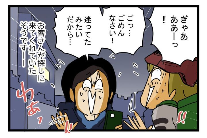 恐る恐る後ろを振り返ると… そこには人の姿が。慌てる配達員に対して謝るその人物はお客さんだったそうで、迷っていた配達員を探しに来てくれたのだといいます。