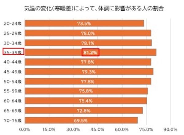 気温の変化(寒暖差)によって、体調にどのような影響が出るか尋ねたところ、30代後半の世代で81.2%にのぼる結果となりました。