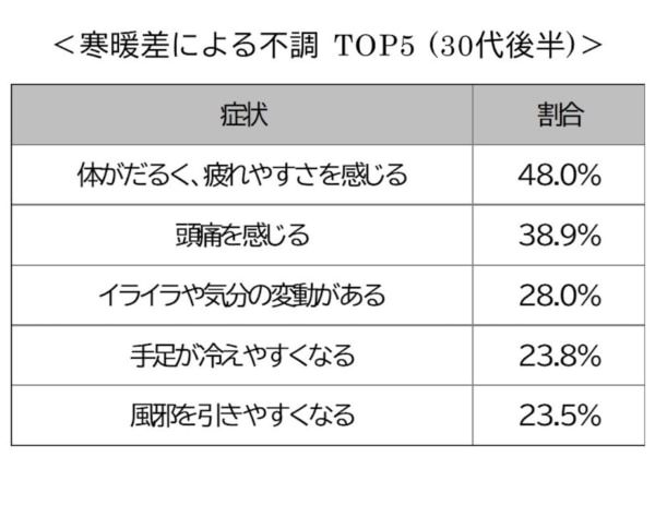 また、具体的な症状についてみると、約3割の人が「寒暖差があると不調になる」(30.5%)や「季節の変わり目に不調になりやすい」(30.2%)といった不調を抱えていることが分かりました。