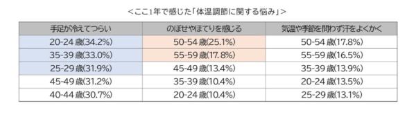 その結果、全体的には30〜40%台で推移する中、36〜37歳が49.1%、52〜53歳が51.0%と平均よりも高い数値となり、体温調節に変化が表れる年齢であることが分かりました。