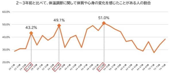 同調査では20〜75歳の女性2,800人(各年齢50名)を2歳刻みに分け、体温調節に関して、2〜3年前と比べて「変化を感じる」と回答した人が多い年齢を「曲がり角」としました。