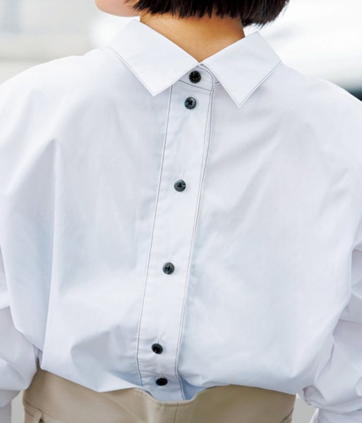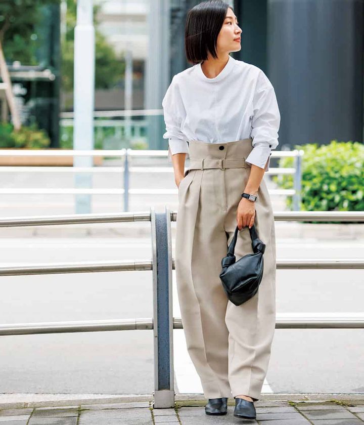 初めましてのシーンでも好感度とオシャレ感を一挙両得。「白シャツを前後逆に。百貨店の人との打合わせなので、黒ではなくベージュパンツを合わせて柔らかさを出すように気をつけます。」