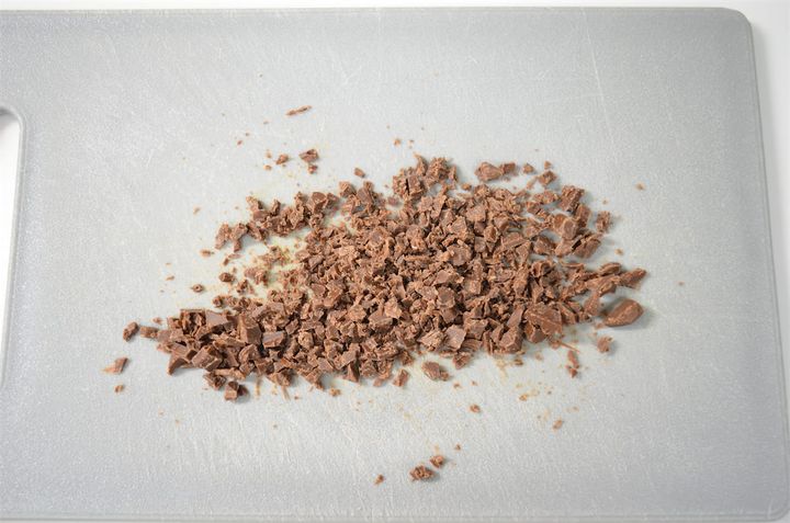 2. 包丁で板チョコレートを刻む。バターは耐熱容器に入れてラップをかけて電子レンジ600Wで10~20秒加熱して溶かしたら、チョコレートを加えて混ぜ溶かす。