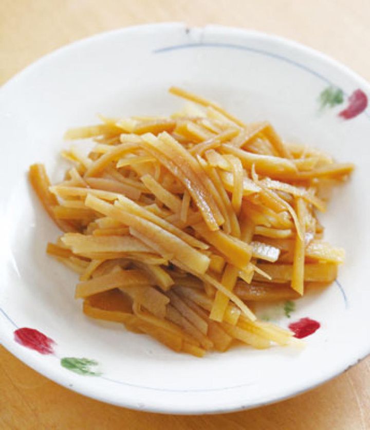 ②しょうゆ大さじ3、酢・砂糖大さじ2、にんにくの薄切り1かけ分を合わせ、じゃがいもを1時間ほど漬ける。冷蔵庫で4〜5日間、保存可能。