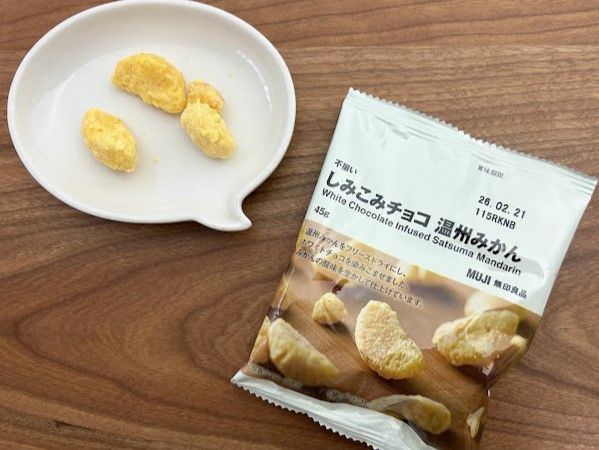 温州みかんをフリーズドライにし、ホワイトチョコをしみこませた商品。主張の強すぎない温州みかんの甘みと穏やかな酸味がほっとする、「ちょっと一息」タイムにぴったりのチョコ菓子です。この「しみこみチョコ」シリーズは他にもリンゴやイチゴがあります。