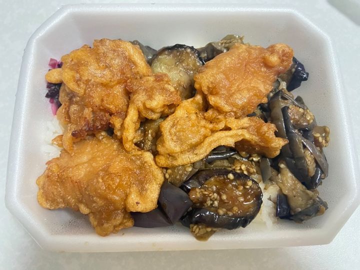 茄子から弁当は、唐揚げが数個と茄子がたっぷり入った弁当でした。甘めのタレが食欲をそそります。ボリュームもありとても美味しかったですよ。450円で購入できるのも嬉しいですね。
