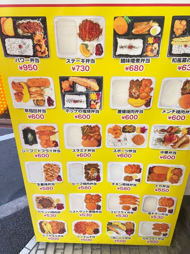 お弁当の種類は、日替わり幕の内弁当・とんかつ弁当・焼肉丼・茄子丼・パワー弁当・早稲田弁当・唐揚弁当など、種類がとても豊富でした。40種類以上あるそうで、300円〜600円で購入できる弁当や丼ものばかりでしたよ。