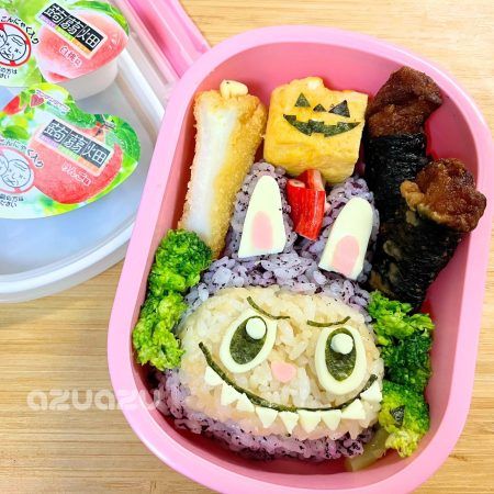 そこまで難しくはなかったけど、朝は時間がないから海苔切りを前日にしておくと焦らないかも。 他のおかず→ブロッコリー、カニカマ、玉子焼き(海苔でハロウィンにしてみた)、のり巻きチキン、はんぺんチーズフライ。 R隊員の幼稚園で使ってたお弁当箱が小さすぎて、何も入らない問題。笑 プチトマトすら大きくて入らなかったよ~。