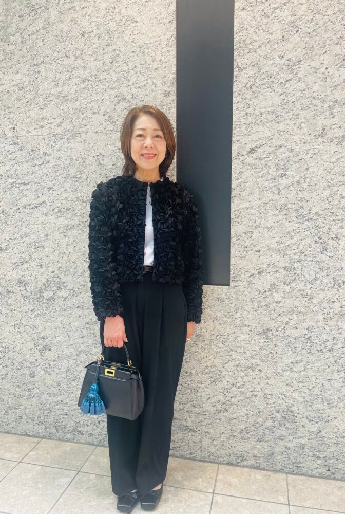 素敵なあの人のイベントに参加をしていた尾崎さん。「長年、当たり前のようにモノトーンを着てきたのですが、年齢を重ねるごとに、カラーにチャレンジしたくなり、少しずつですが、カラーも取り入れるようになりました。今日は、セットアップ見えする『ルーニィ』のニットとスカート。スカートの金ボタンを見て、ニットはマスタードイエローと相性がいいと思い、選びました」