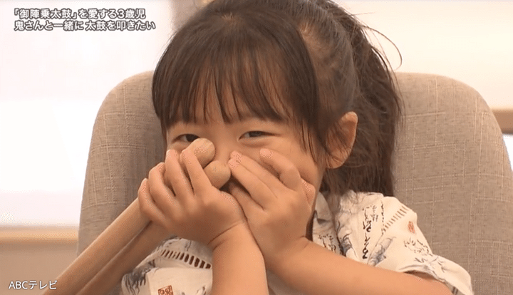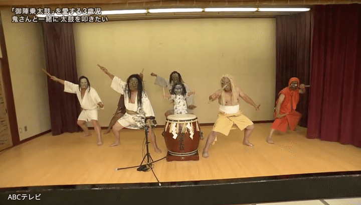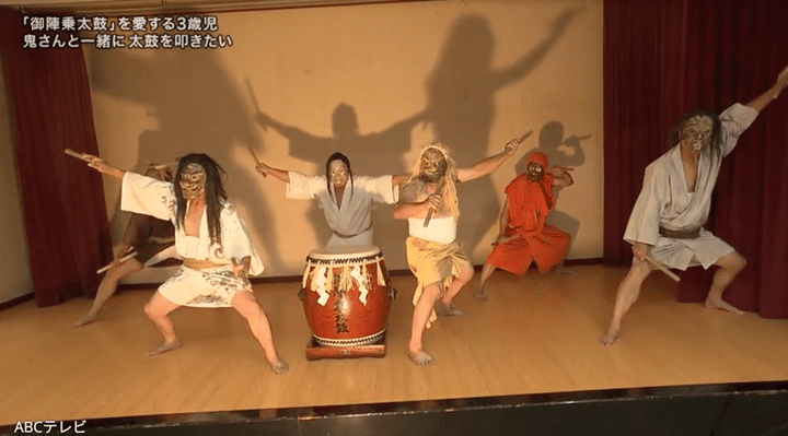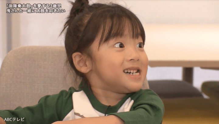 3歳児に「御陣乗太鼓のどこが好き?」と質問すると、「やしゃめん(夜叉面)」(太鼓のたたき手が付ける鬼の面)という返答があった。そして鬼の顔真似をしてくれる3歳児。ただただかわいい。