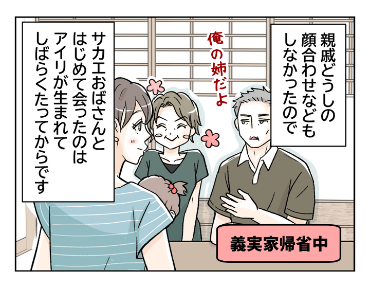 今回の主人公はアラサーの専業主婦のミナさん、二児のママです。夫・ショウジさんとは、学生時代から付き合いはじめて結婚となりました。義両親は遠方に住んでいて、交流は少ないものの優しくおおらかな人で助かっているそう。しかし近所に住む義父の実姉・サカエおばさんはクセ強キャラ。ある日義両親がサカエおばさんの家に泊まることになり、「内緒で」宿泊の支度をやるようサカエおばさんから電話がかかってきました。