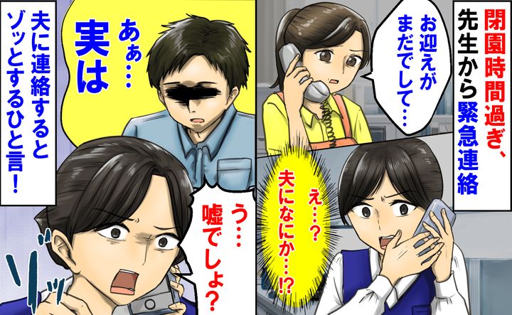 「お迎えが…」閉園時間過ぎ、先生から緊急連絡!夫が担当なのに…慌てて夫に連絡するとゾッとするひと言
