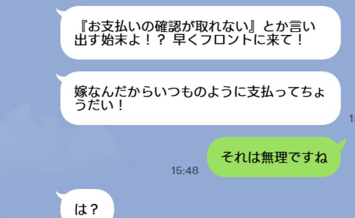 「落ち着けないわよ!『お支払いの確認が取れない』とか言い出す始末よ!? 」「早くフロントに来て! 嫁なんだから支払ってちょうだい!」