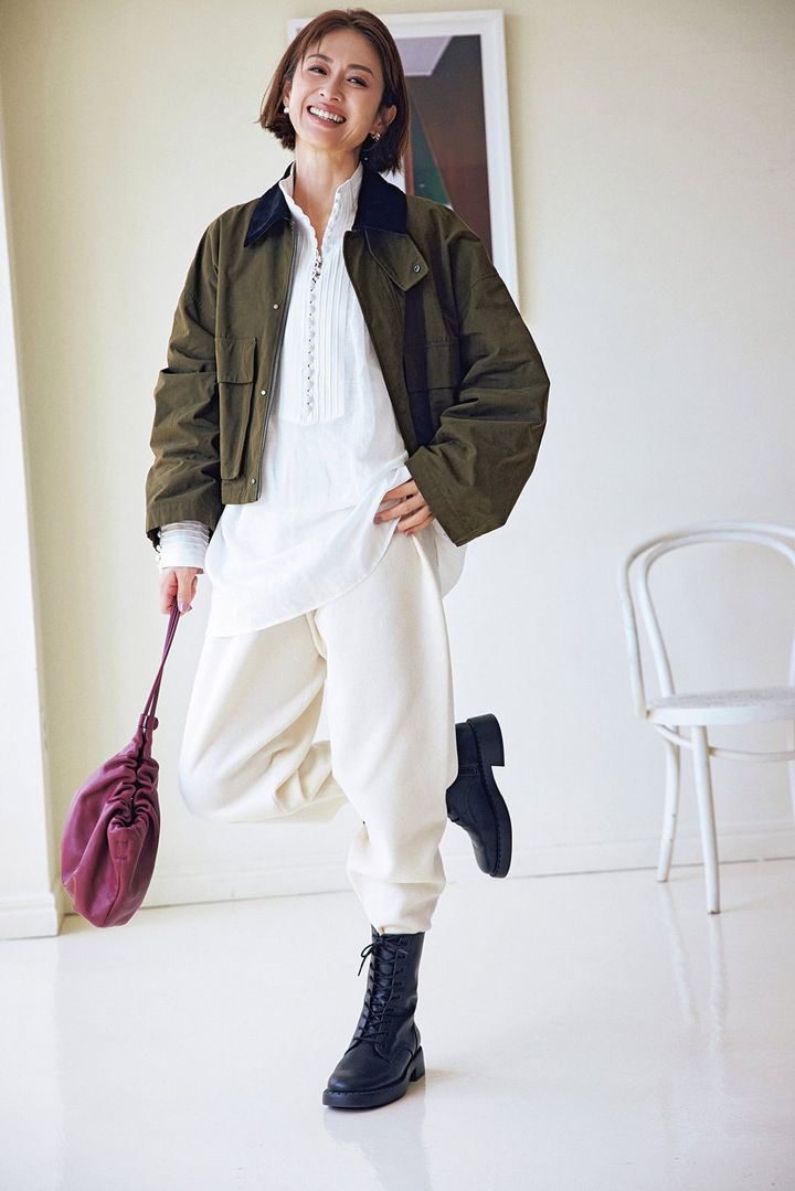 ニットで洗えるだけでも驚きの中、なんとマシンウォッシャブルで毛玉防止加工もあり。白ニットでも安心して冬までガンガン穿ける。カーキJKとブーツ合わせでミリタリー感を漂わせて。ゆったり感とニット素材で動きやすさも着心地も快適。フェミニンなブラウスをインナーにミリタリー感の中に女っぽさを。