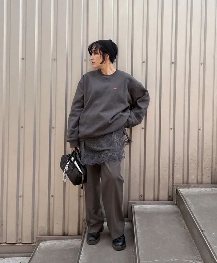 スエットの裾からレースをのぞかせて洒落たバランスに