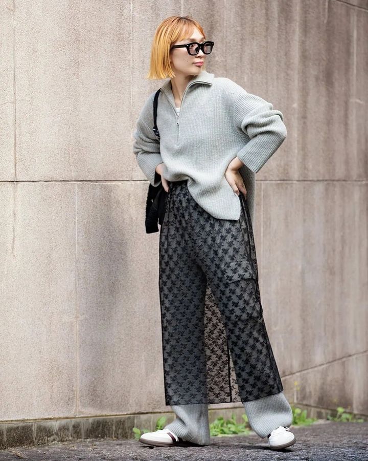 スタイリストの金子綾さんらしいオールブラックの着こなしに、パッと目を引くレーススカート。スカート以外はシンプルなプルオーバーやスラックスなのに、レースがプラスされるだけで旬のムードにシフト。繊細なレースでヌケ感が出るので黒でまとめても重く見えません。