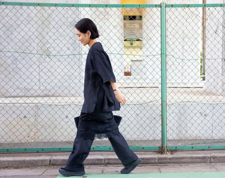 Chaosのトップスとパンツ、Stella McCartneyのスカート、THE ROWのバッグ、HOKA®のスニーカー、その他本人私物