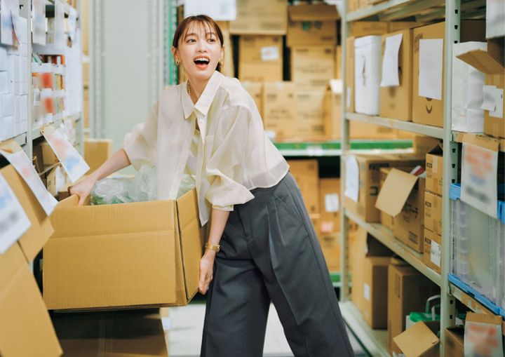 力仕事の日はスポーティなパンツルックで倉庫作業。シルバースニーカーはきれいめになじみやすいし、印象も軽やかだから通勤服にもピッタリ。