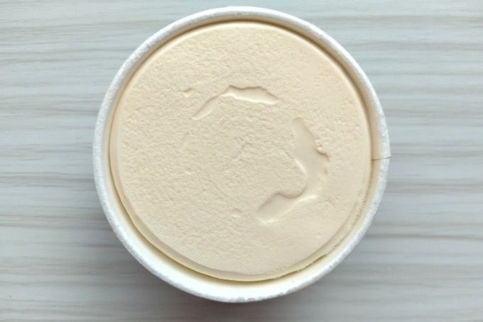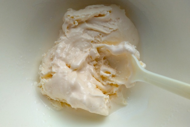 2.バニラアイスをボウルに入れ、スプーンでやわらかくなるまで混ぜます。