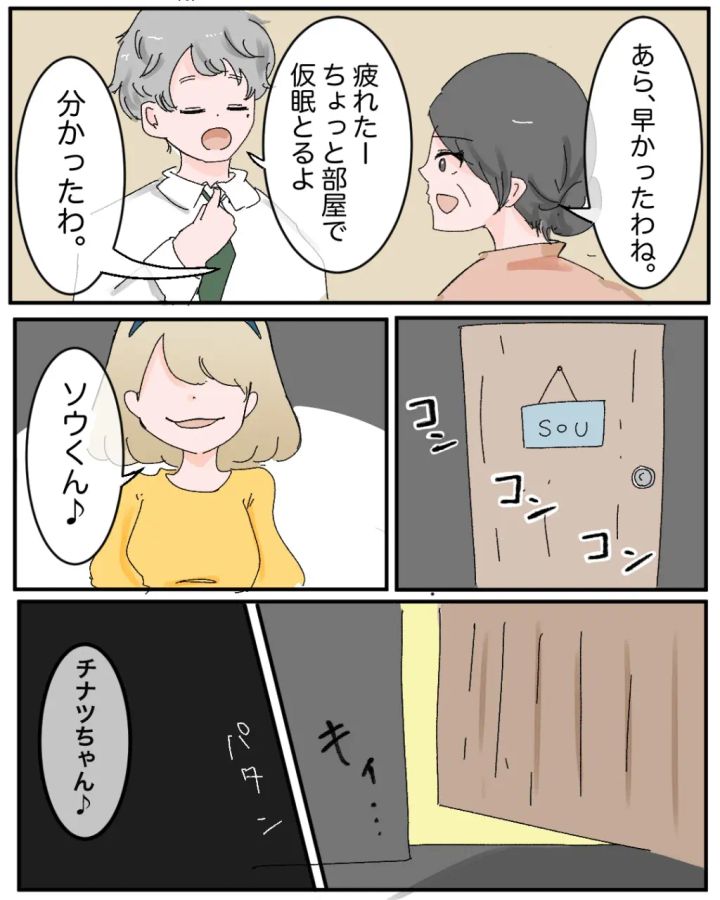 しばらくして、ソウが実家に帰ってきました。「疲れたーちょっと部屋で仮眠とるよ」と、来て早々自室にこもるソウ。すると見計らったように、「ソウくん♪」とチナツが部屋のドアをノックしました。「チナツちゃん♪」ゆっくりとドアを開け、チナツを迎え入れるソウ。これで2人目も安泰だね・・・そう聞こえたような気がしました。