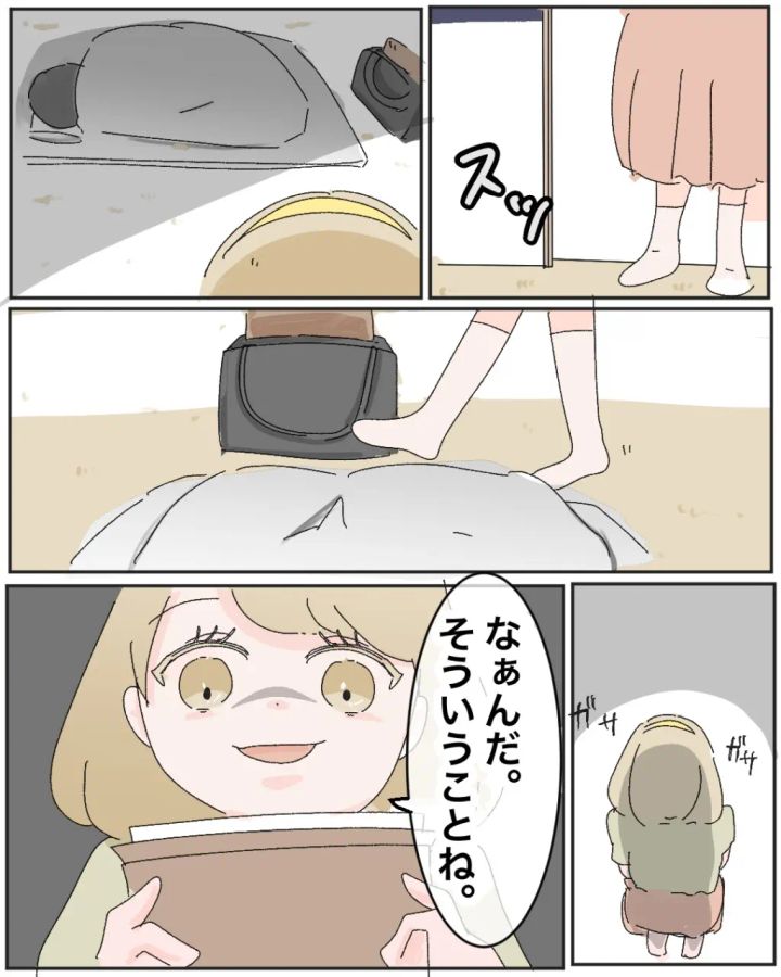 自室で横になっていると、チナツが部屋に入ってきました。俺のカバンから不自然にはみ出した封筒を見つけると、おもむろに中身を取り出し、「なぁんだ、そういうことね」と口元を緩ませました。